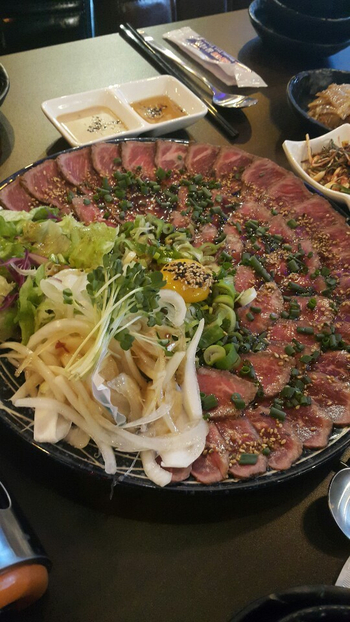 일단 비주얼이 너무 멋있어서 사진을 찍게 됩니다. 윗글에 설명 하였 듯이, 신선한 야채들과 함께 먹어도 되며 노른자를 살짝 풀어 찍어 드셔도 엄청 맛있습니다. 소스와 기름장에 찍어 드셔도 맛이 좋습니다.